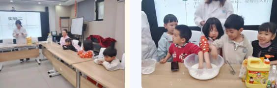 克己熔岩灯试验中,酸碱中和发生的气泡带着色素在瓶中络绎,如“海底火山喷射”;彩虹桥试验里,纸巾上的渐变色“彩虹”顺着毛细现象攀爬而上,这一奇特现象让孩子们惊叹不已;拍不破的“铁壁泡泡”试验,特别泡泡液调配出的泡泡在棉手套拍打下弹起,孩子们直呼“科学家太酷了”。